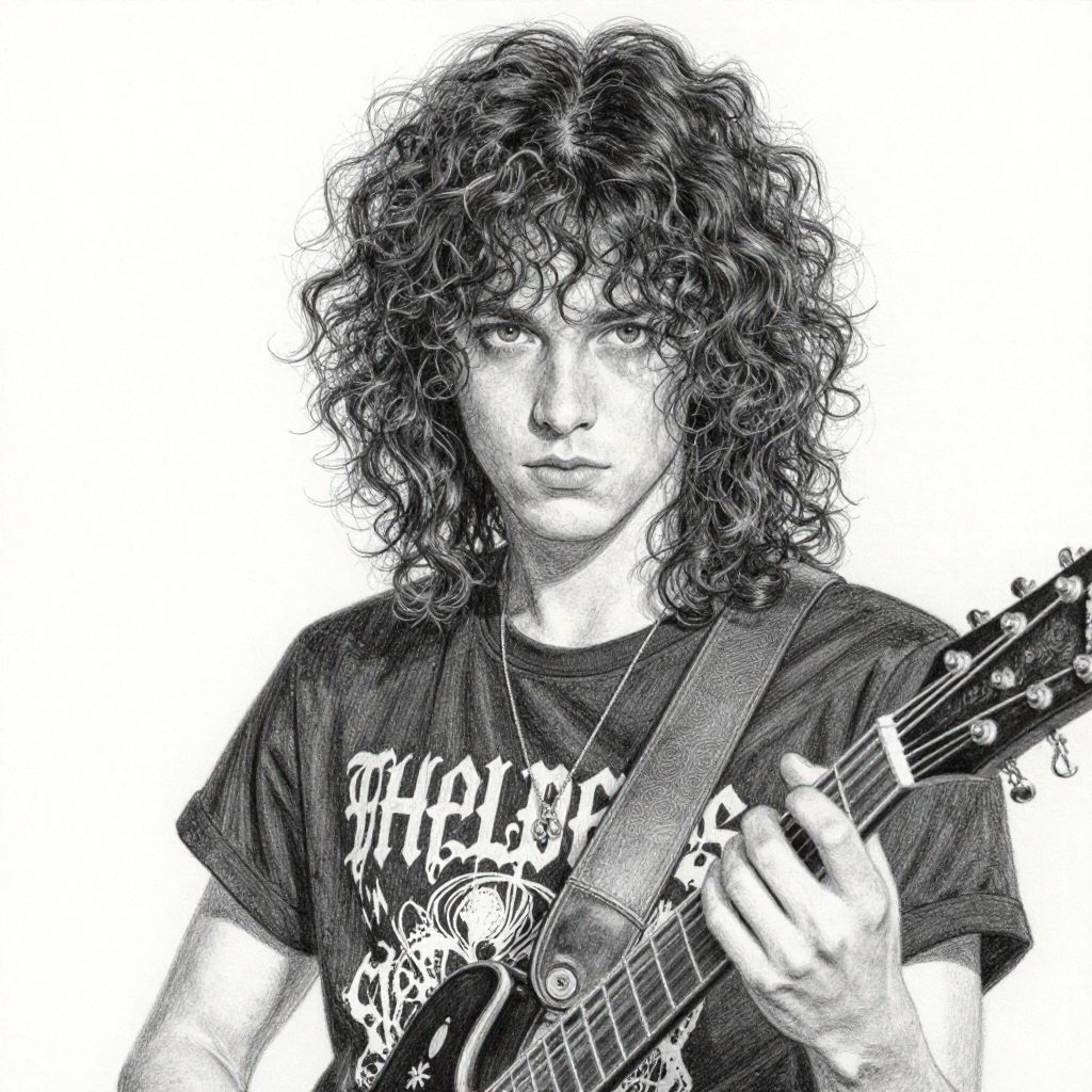 Black-and-white digital drawing of a young man with curly, shoulder-length hair, intense gaze, and pale skin. He wears a dark T-shirt with white, stylized text and graphic design. He holds an electric guitar with a strap over his shoulder, his right hand gripping the neck. The background is plain white, emphasizing the detailed, textured shading and line work of the subject. The drawing has a high-contrast, almost monochromatic style, focusing on the musician's focused expression and intricate hair texture.