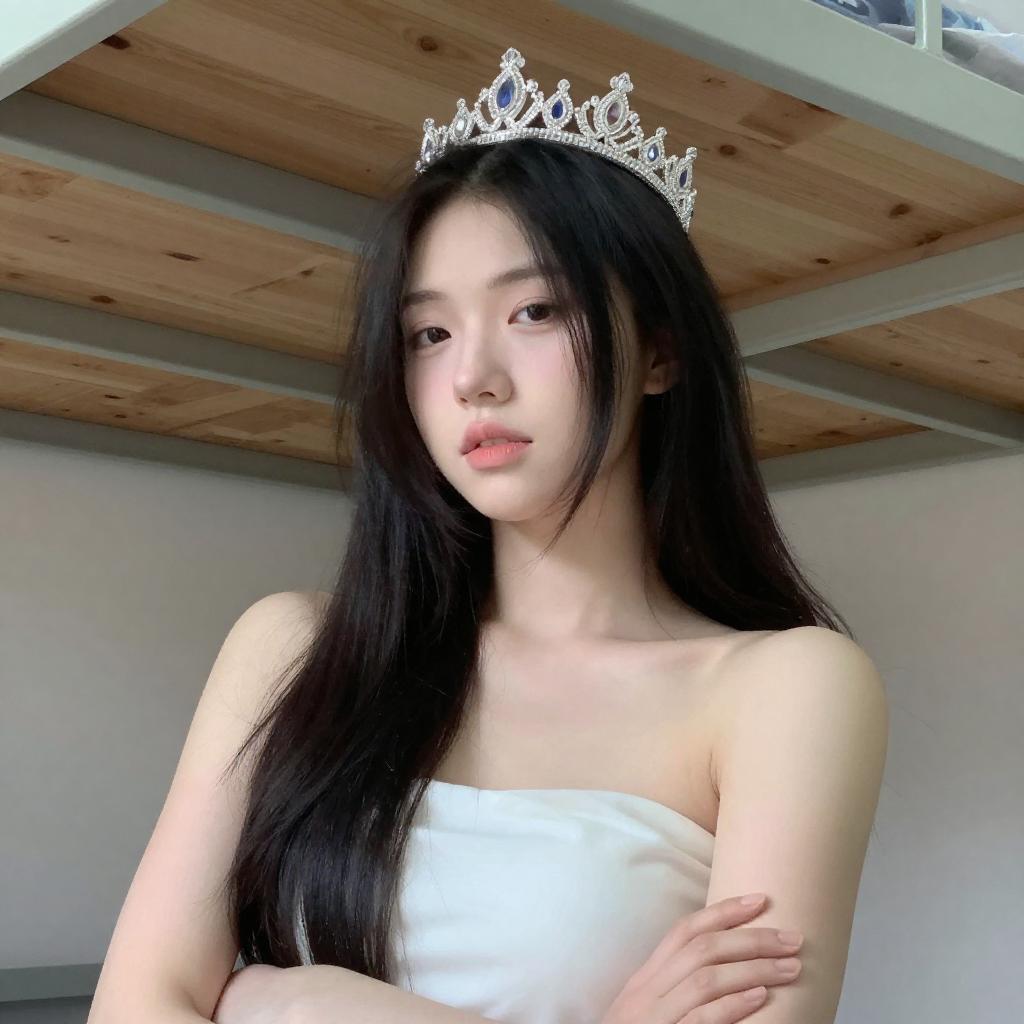 Photograph of a young woman with long, straight blonde hair wearing a sparkling silver tiara and a white, strapless, lace corset top with a ruffled skirt. She holds a cigarette in her right hand, standing in a dimly lit room with a white door in the background.