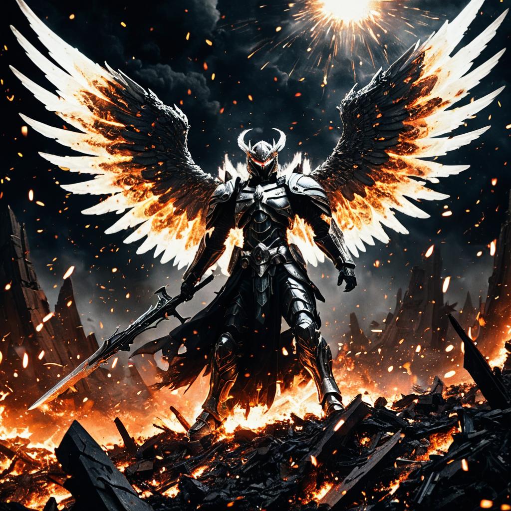 A twisted archangel, with jagged metallic wings and blazing white eyes, emerging from a scorched celestial battlefield, surrounded by falling embers and shattered halos, depicted in the intense and nightmarish style of Kentaro Miura.