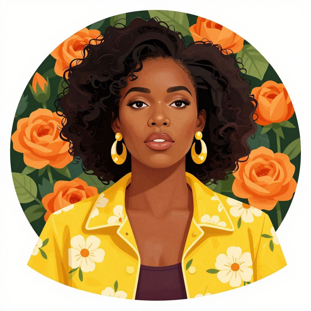 A vibrant digital illustration featuring a portrait of a woman with bold, natural hair, adorned in a yellow floral jacket against a circular background of orange roses and green foliage, showcasing a contemporary artistic style reminiscent of Kehinde Wiley's portraiture.