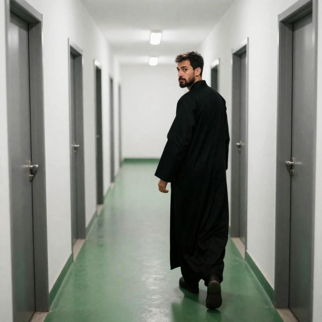 Photograph of a man in a long black robe walking down a long, empty, white-walled hallway with green floors. He looks back over his shoulder. Doors line both sides of the hallway. Bright, even lighting. The man has short dark hair and a beard. He stands slightly off-center in the middle of the hallway.