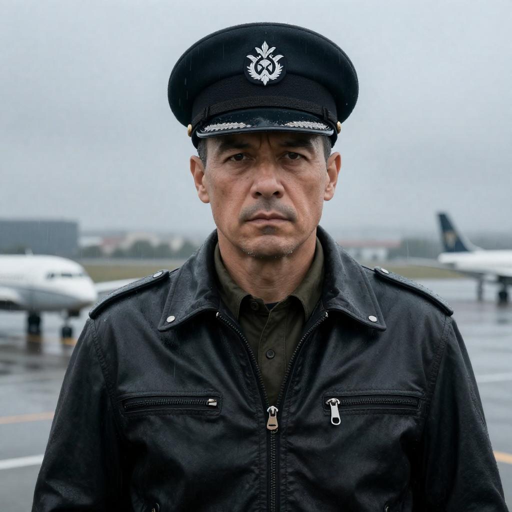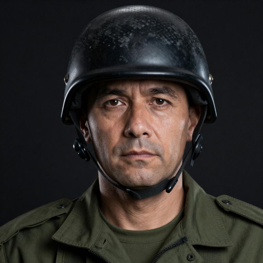 Photograph of a middle-aged man with a serious expression, wearing a black metal helmet with a mesh pattern and a dark green military uniform. His light skin is slightly tanned, and he has short dark hair. Dark background.