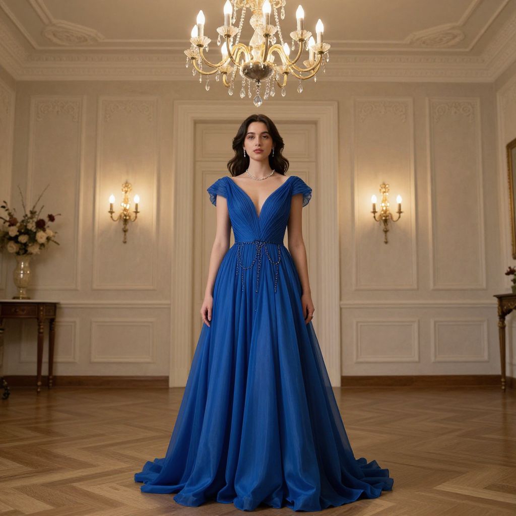 Photograph of a woman with fair skin and dark wavy hair, standing in an elegant, ornately decorated room. She wears a floor-length, royal blue, V-neck gown with short, embellished sleeves and a flowing, fitted bodice that transitions into a voluminous skirt. The room features a chandelier with glowing candles, cream-colored walls with intricate molding, and two wall sconces emitting warm light. A wooden table with a floral arrangement is positioned on the left, and a parquet wooden floor covers the space. The woman's expression is serene, and she is centered in the frame, exuding a sense of grace and sophistication.