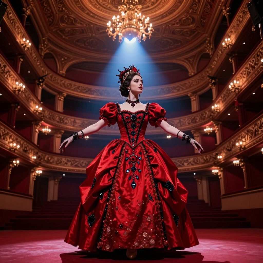 Gothic-inspired ballerina in a vibrant red, black-embellished gown, standing gracefully in a grand, ornate theater with a