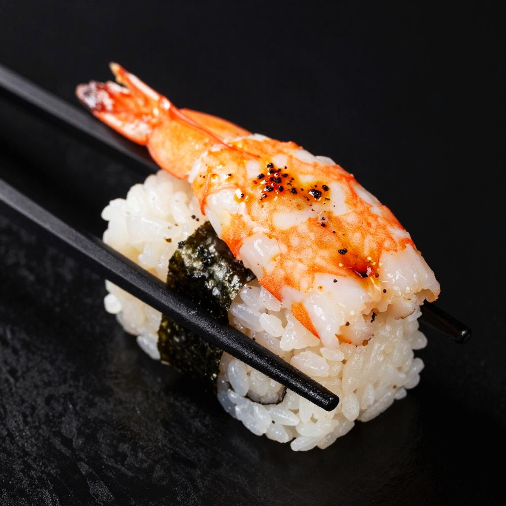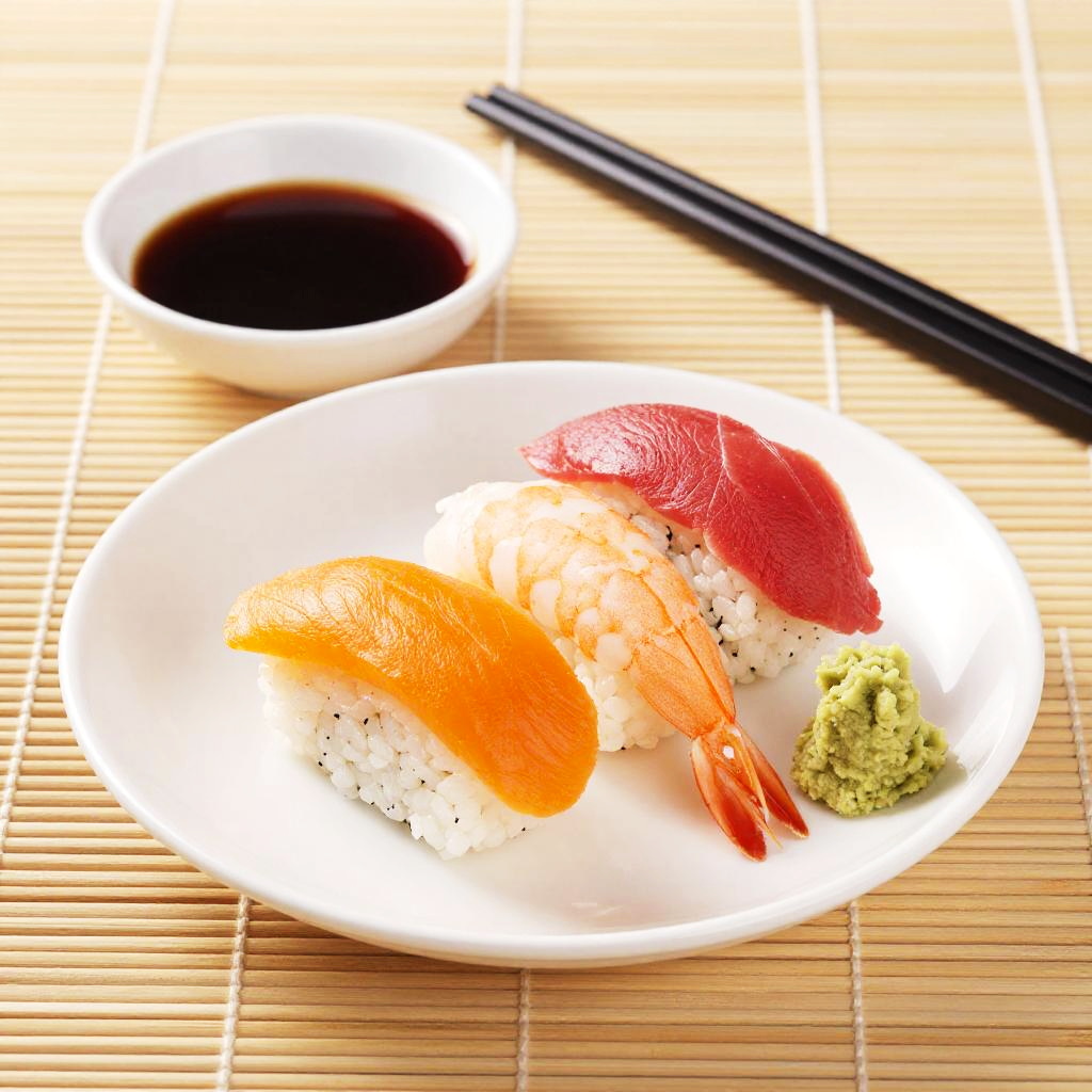 A vibrant photograph of a white plate with three colorful sushi pieces. There's a bright red and black nori-wrapped piece on top, a pink shrimp nigiri in the center, and a shiny orange pickled ginger piece below. A small mound of green wasabi is on the left. The plate is on a bamboo mat, adding a rustic touch.