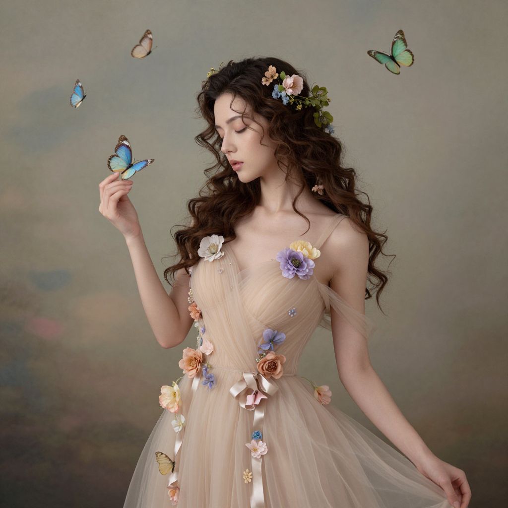 The image depicts a hyperreal, high-detail scene of a woman in a beautiful beige gown adorned with pastel flowers and ribbons, set against a backdrop of muted greens, pinks, and blues. Her hair, styled in loose waves, is intricately intertwined with delicate floral arrangements, creating a harmonious blend of nature and elegance. Floating around her are several butterflies, their wings a mix of soft blues and greens, adding a sense of whimsy and movement to the composition. The overall arrangement of elements suggests a serene and dreamlike atmosphere, with the woman's closed eyes and the gentle, flowing lines of her gown and hair creating a sense of tranquility and grace. The spatial relationships between the woman, the flowers, and the butterflies are carefully balanced, contributing to the image's cohesive and visually appealing structure.