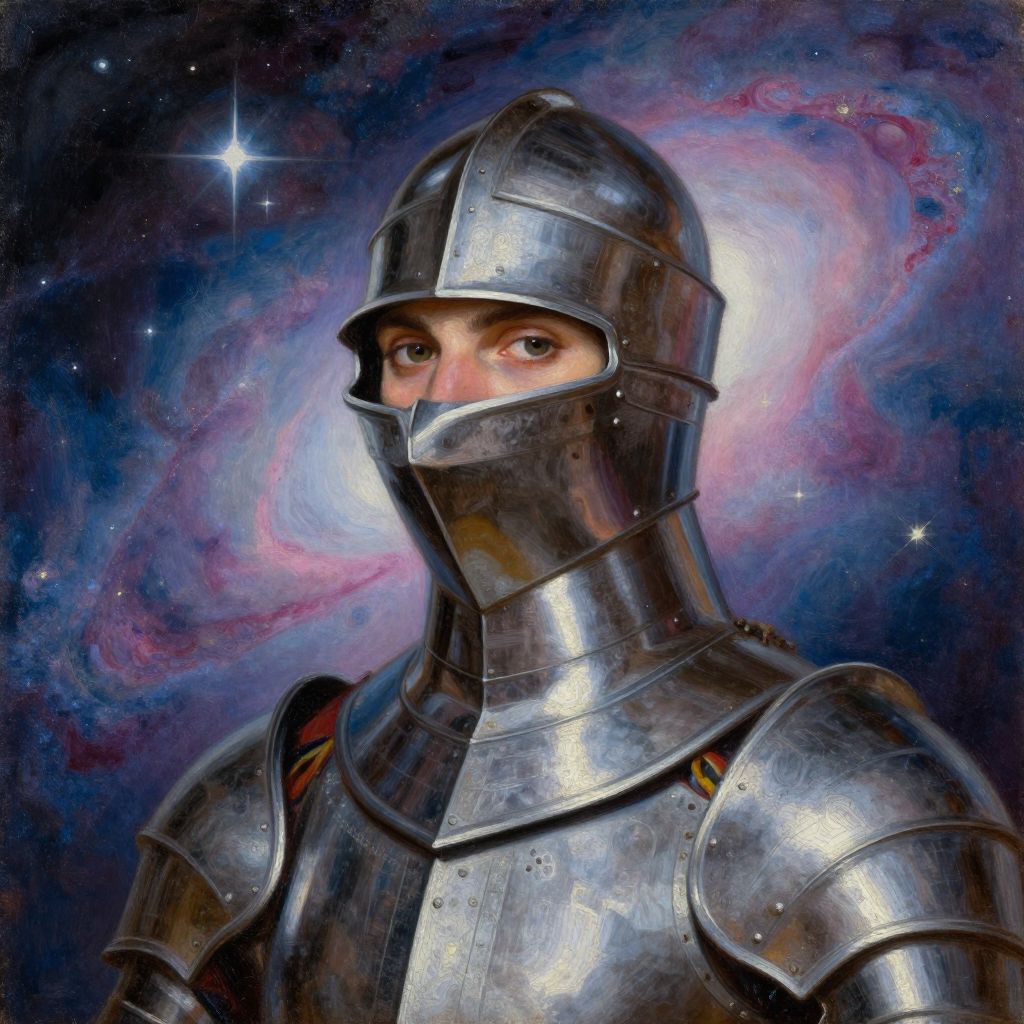 Digital painting of a knight in shiny, reflective armor with a visible eye, set against a cosmic background of swirling blue and pink nebulae with sparkling