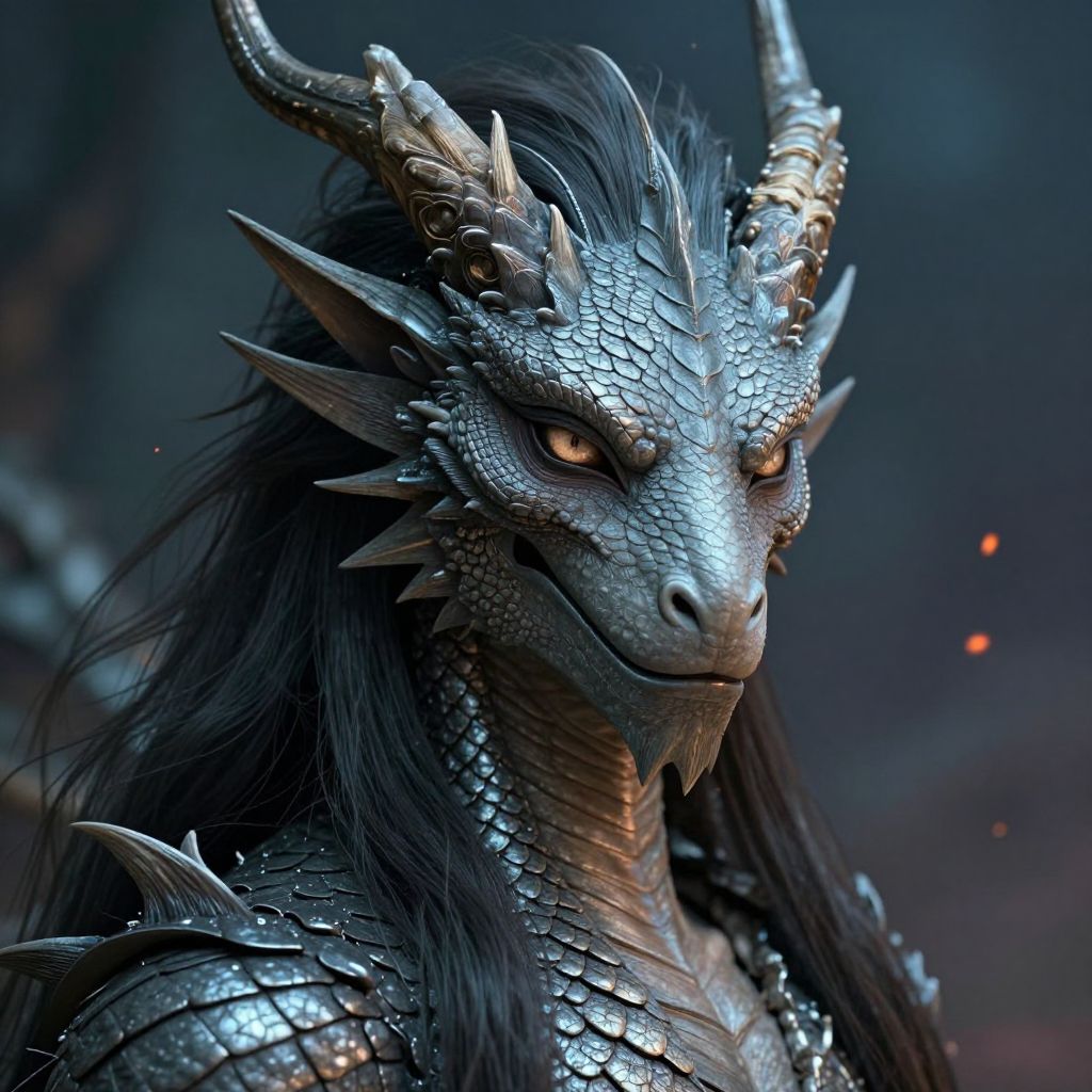 Digital artwork depicting a fierce, anthropomorphic dragon with blue-scaled, textured skin and sharp, golden horns. The dragon has piercing orange eyes, a pronounced snout, and black, flowing hair. Its armor-like scales are detailed and shiny, reflecting light. The background is a dark, smoky blue with small, glowing red embers, adding a mystical atmosphere. The dragon's expression is intense and focused. The overall style is realistic with a fantasy theme, emphasizing the dragon's powerful and regal presence.