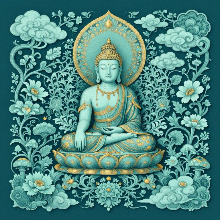 The image presents a striking, intricate composition dominated by a dark turquoise paper with elaborate designs. At the center, a mandelbulb fractal Southeast Asian Buddha statue is prominently featured, adorned with golden layers, flowers, clouds, vines, mushrooms, and swirled patterns. The statue is surrounded by a complex array of textures, including detailed cloud formations, delicate vines, and lush flowers, all rendered in a harmonious blend of light and dark turquoise hues. The overall composition is balanced, with the statue positioned centrally, and the surrounding elements creating a sense of depth and dimension. The interplay of colors and textures, along with the intricate details, gives the image a sense of depth and complexity, reminiscent of the work of Hokusai and Mike Mignola. The image is a trending illustration on ArtStation, showcasing the artist's mastery of intricate design and color.