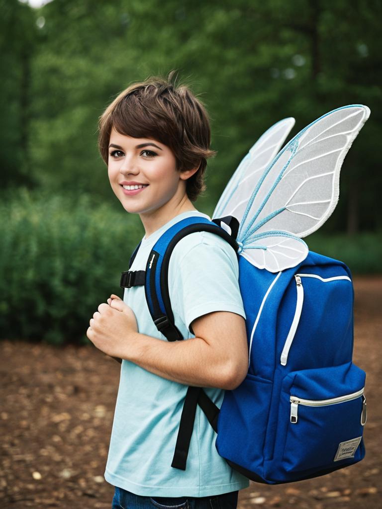 Funny tooth fairy costume, solo, male focus, 1boy, realistic, backpack, blue eyes, wings, bag, looking at viewer, brown hair, outdoors, day, blurry