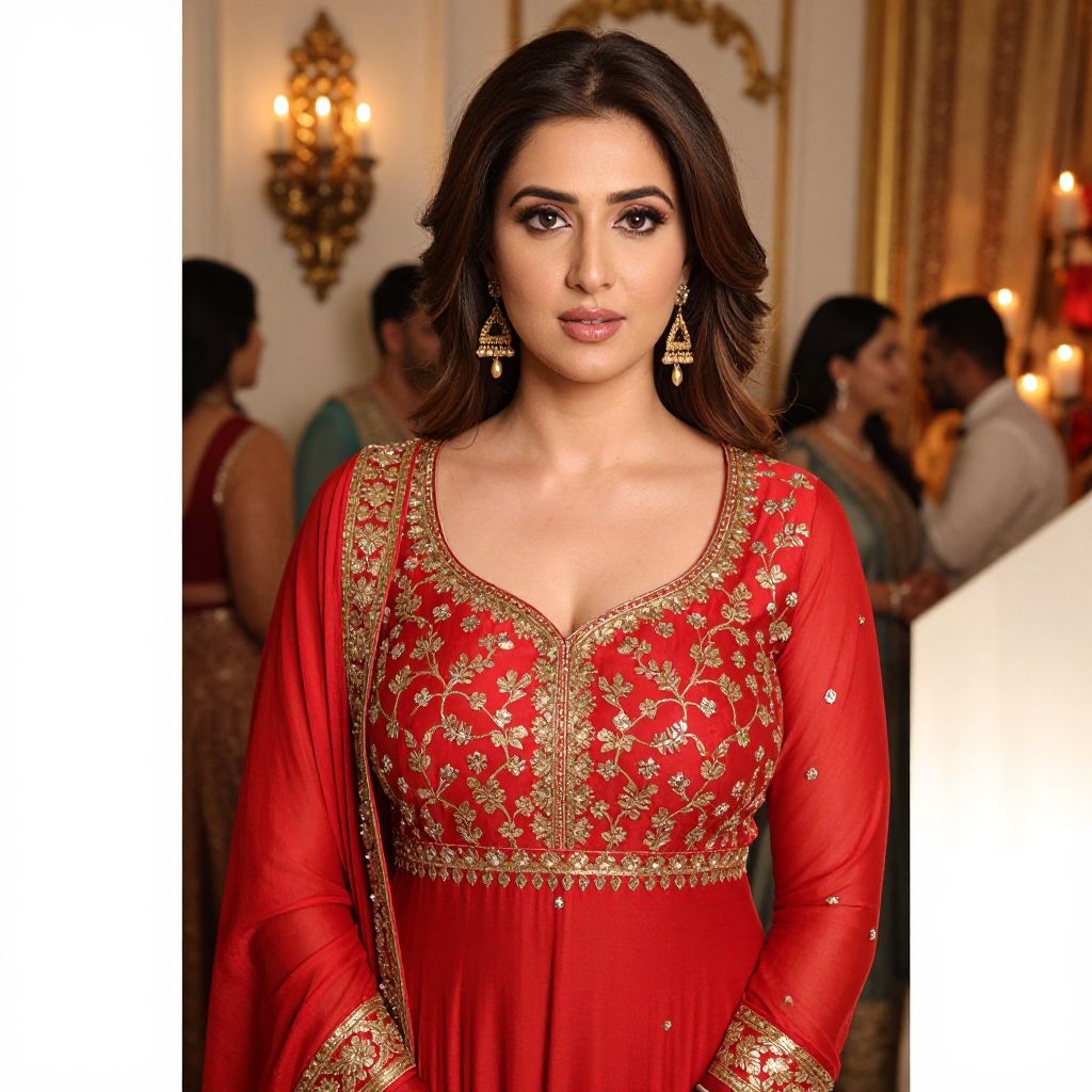 A woman with warm brown eyes and smooth, fair skin wearing a vibrant red party wear anarkali suit with gold embroidery, standing in a luxurious indoor evening party setting with soft candlelight and traditional Indian decor in the background, surrounded by guests in festive attire.. The woman has big tits and cute face