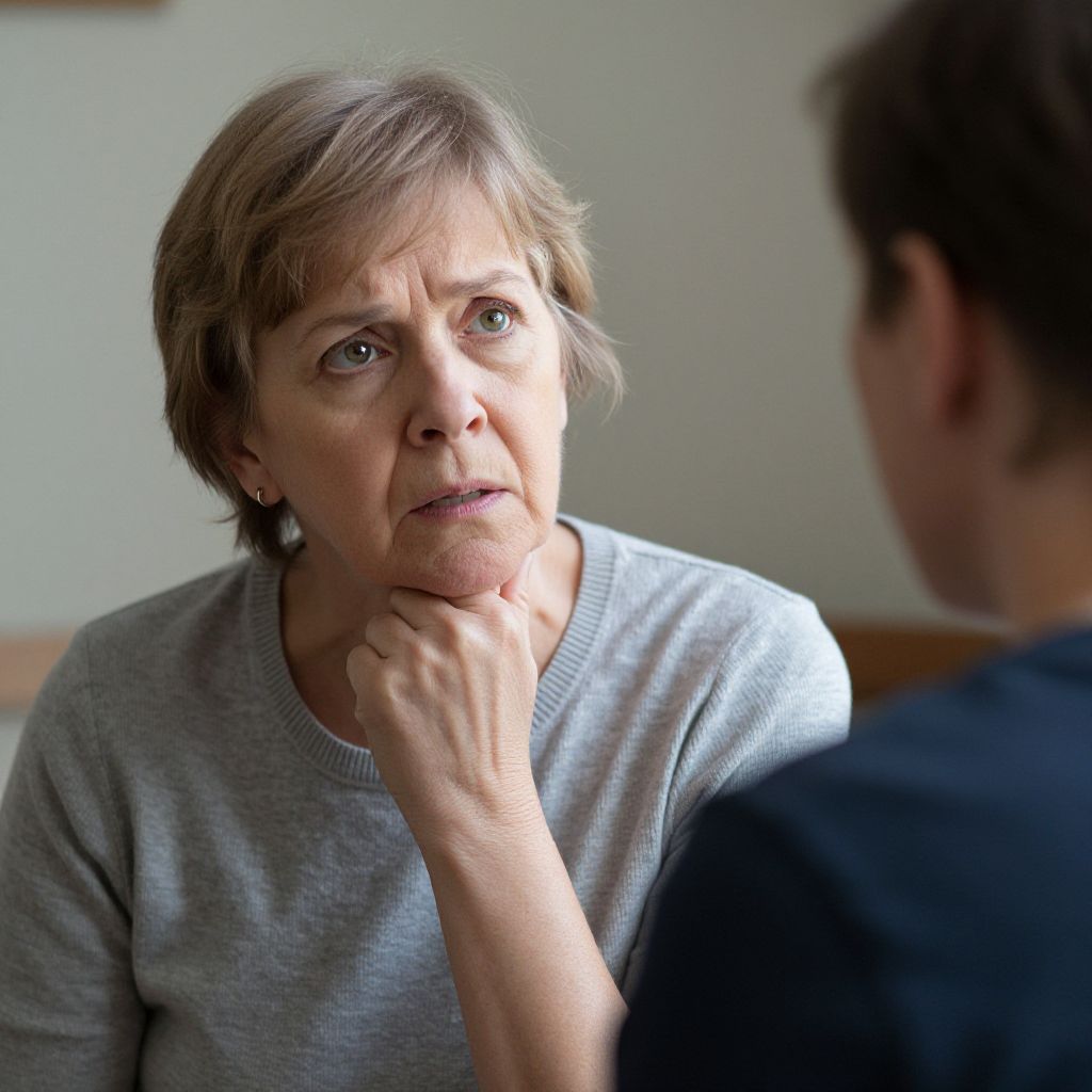 Senior woman engaged in a serious conversation with another individual, her expression conveying concern and attentiveness as they face each other indoors.