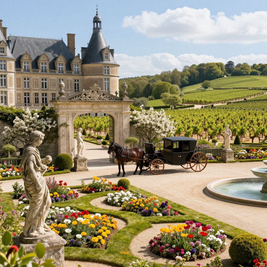 Photograph of a grand, French-style chateau with grey slate roofs and tall windows, set in a lush, sunlit garden. In the foreground, a stone statue of a robed figure stands among vibrant flower beds with yellow, red, and white blooms. A classical stone archway leads to a black horse-drawn carriage parked on a curved gravel path. To the right, a circular stone fountain is surrounded by greenery. The background features rolling vineyards and a bright blue sky with scattered white clouds. The scene exudes elegance and pastoral beauty.