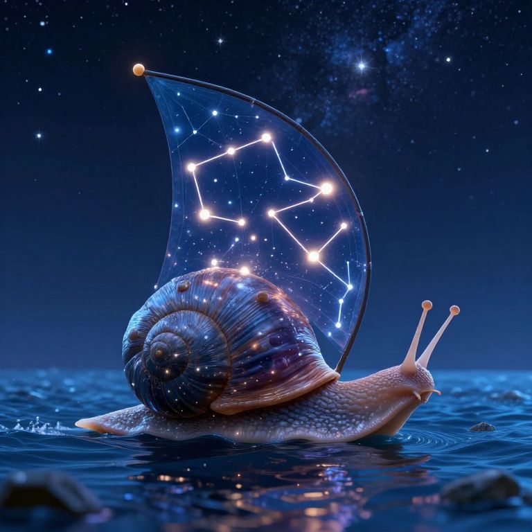 A whimsical 3D-rendered fantasy scene depicts a giant snail traversing a cosmic ocean under a starry night sky, its shell adorned with constellations serving as a sail illuminated by glowing lights, creating a magical and surreal visual effect.
