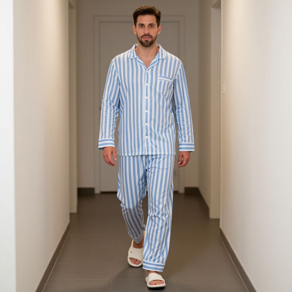 Pajama Party Costume, man in pajamas and sandals walking down a hall