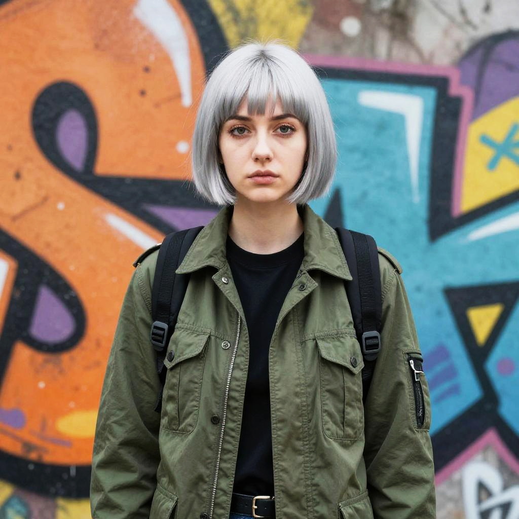 Photograph of a young white woman with light skin and shoulder-length, brown hair with blonde highlights, standing against a graffiti-covered wall. She has blue eyes, a small nose piercing, and is wearing a light gray, long-sleeve hoodie. Her right hand is gently touching her chin, and she has a contemplative expression. The graffiti in the background features bold, black, and red lines on a white backdrop, creating a contrast with her light clothing and pale complexion. The image has a high-contrast, slightly gritty texture, emphasizing the urban setting.