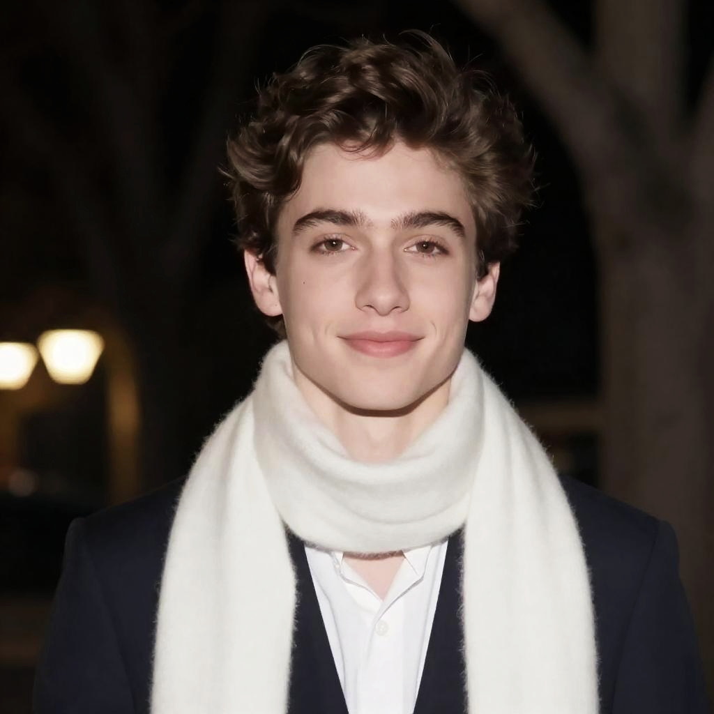 Young man with curly brown hair, smiling, wearing a dark blue knit hat and brown plaid scarf, black coat, standing outdoors. Partially visible woman with light brown hair, smiling, on the left. Leaf-covered ground and bare trees in the background.