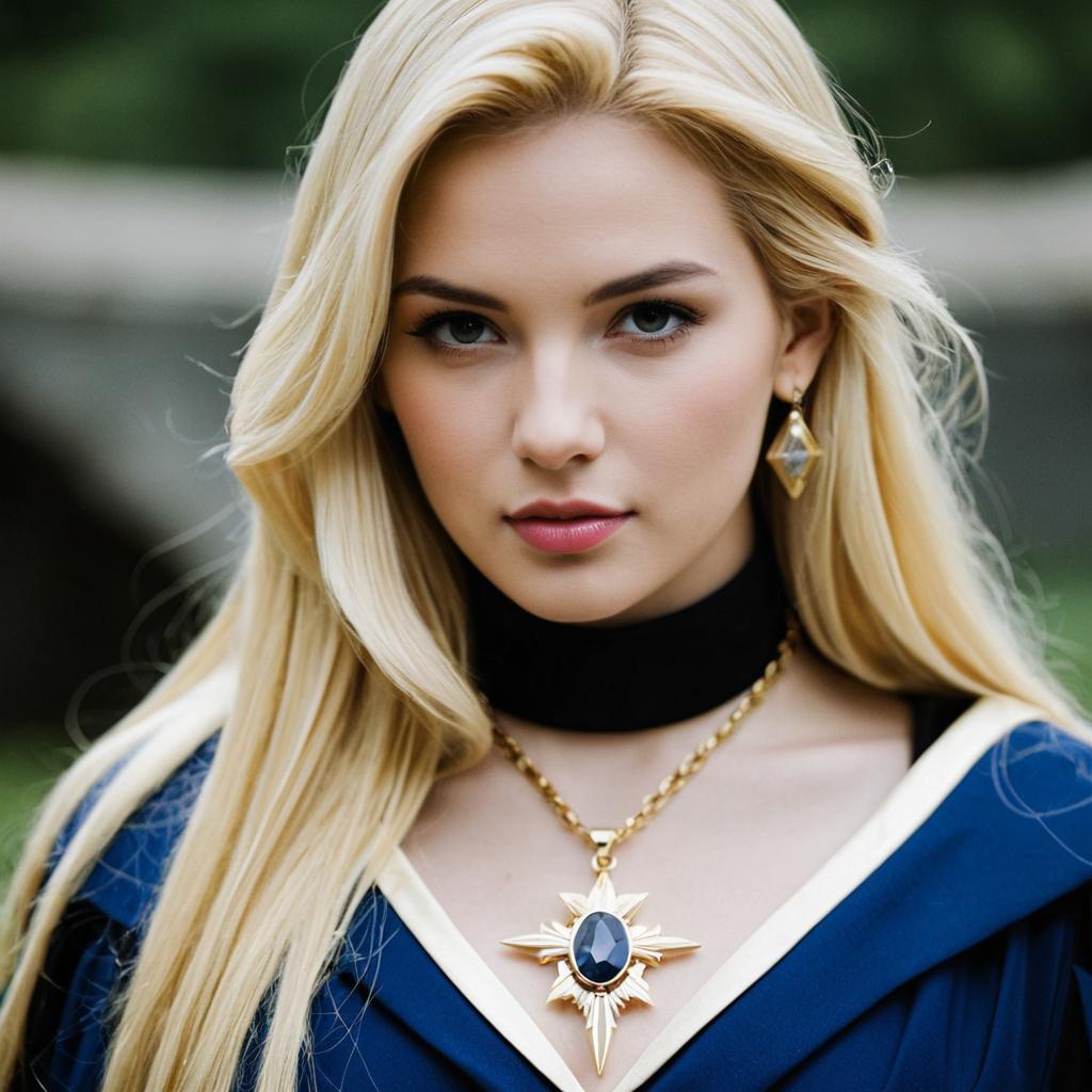 Olivier armstrong cosplay,1girl, blonde hair, solo, long hair, looking at viewer, blurry background, blurry, jewelry, necklace, lips, realistic, upper body