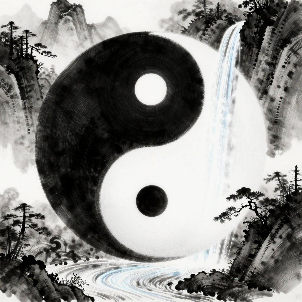 Yin and yang concept art, Minimalism black and white ink illustration of Beautiful Japanese waterfall mountain landscape, iridescent light blue water fountain, Alex maleev, Ashley Wood, Carne Griffiths, elegant, intense hatching style, sumi ink, sharp and fine focus, high opacity mysterious, ultra high quality, Epic composition, sharp ornate details, high contrast, intricate complexity, ethereal, magical, photorealistic hatching, masterwork by head of prompt engineering
