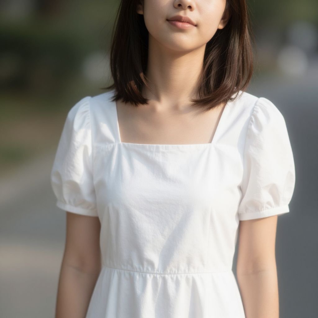 Photograph of an Asian woman standing in a grassy outdoor setting with dark green foliage in the background. She has straight black hair with bangs, wearing a wide-brimmed straw hat and a short-sleeved, white, square-neck summer dress with a cinched waist. Her expression is neutral, and she stands with her arms relaxed by her sides. The bright white of her dress contrasts with the darker background, highlighting her figure. The image has a soft, slightly blurred effect, emphasizing her as the central focus. The lighting is natural, suggesting a daytime setting.
