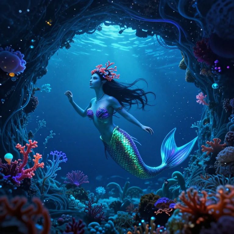 Craft an enchanting image that encapsulates surrealism, showcasing a siren gracefully positioned atop a buoyant palace constructed from luminescent materials submerged within the vast oceanic depths. This whimsical scene artfully intertwines mythical creatures with mechanical elements as the captivating siren adeptly manipulates an intricate clockwork mechanism. Her mesmerizing tail, adorned with scales that mirror the sparkle of precious gems, infuses this aquatic domain with a touch of enchantment. Capture the whimsical ambiance of this captivating underwater world brimming with exotic marine life, vibrant coral formations, and alluring bioluminescence from an intriguing 'bug's-eye view'.