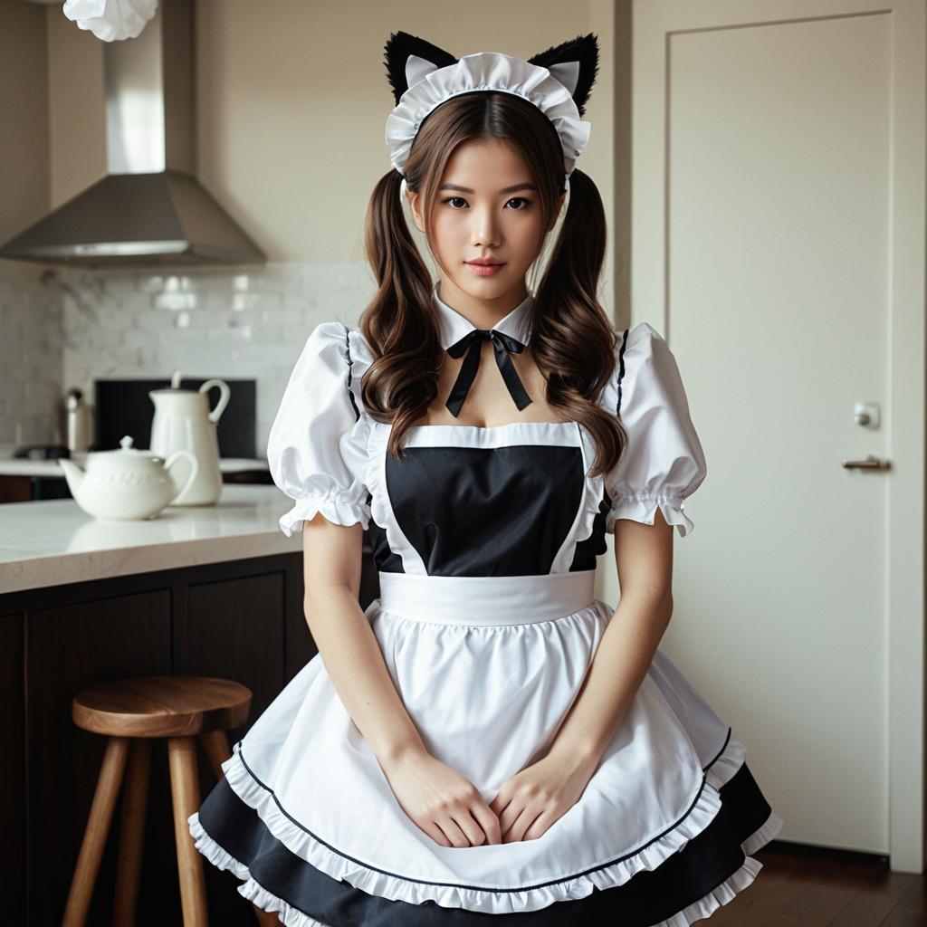 Kitty maid outfit ,1girl, animal ears, solo, cat ears, brown hair, dress, long hair, looking at viewer, maid, indoors, maid headdress, short sleeves, puffy sleeves, apron, white dress, puffy short sleeves, wrist cuffs, brown eyes, realistic, closed mouth
