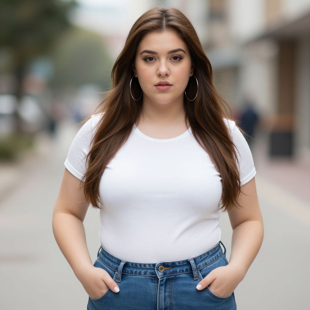 Photograph of a young Latina woman with long brown hair, wearing a white t-shirt and blue jeans, standing with hands in pockets on a blurred urban