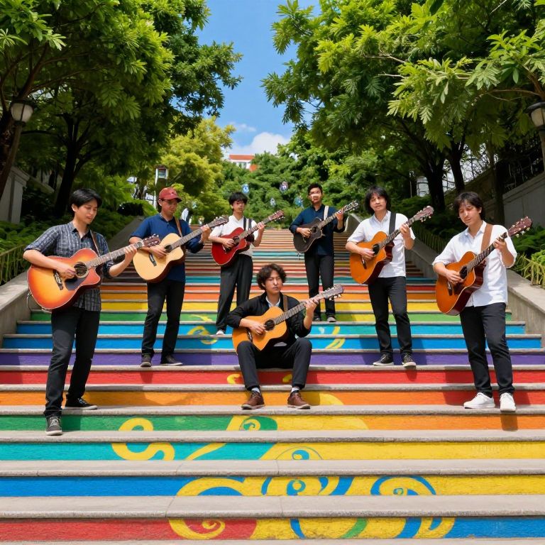 Musicians stand and sit on vibrant, rainbow-colored steps, each step adorned with swirling patterns, as they play guitars while surrounded by lush green trees under a clear blue sky.