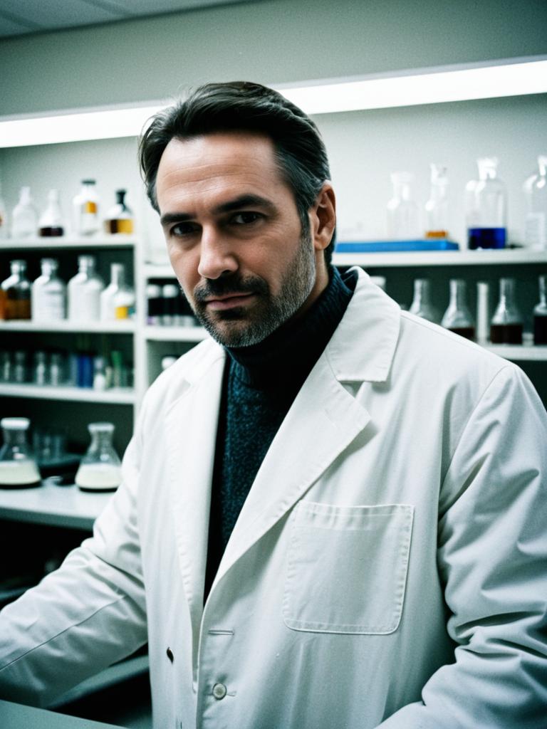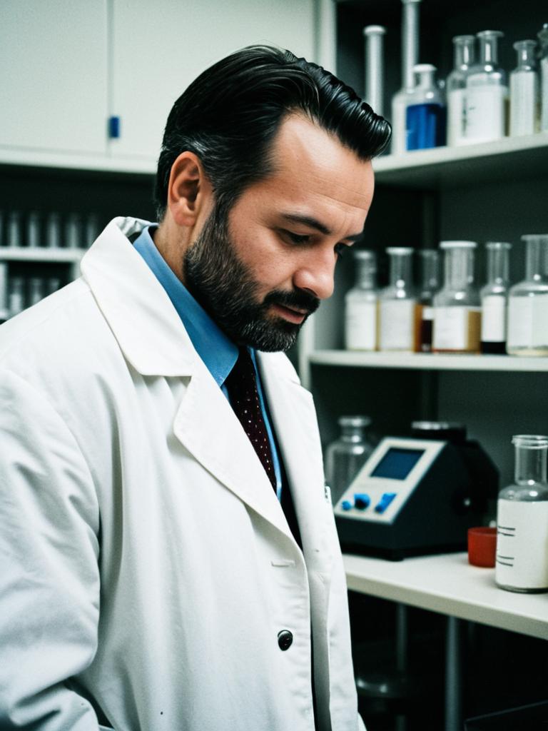 Candid portrait of a man wearing a white lab coat and blue shirt with tie, standing in a laboratory setting. The background features shelves with various glass bottles, scientific equipment, and laboratory instruments. The man has dark hair and beard, appearing focused.