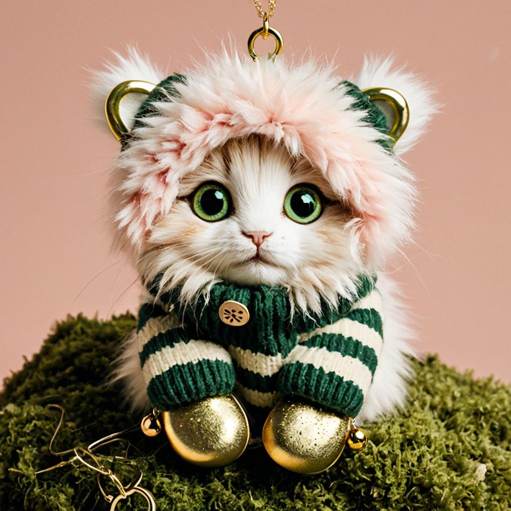 Digital artwork of a cute, rounded fluffy creature with big green eyes, the fur on top of the head is muted rose with soft shimmering spots, fur in front of the body is buttermilk yellow, and the rest of the body is deep moss green, with tiny gold fingers and toes, wearing striped mittens and wooden charm necklace, set against a dusky peach background with painstaking brushstroke effect.