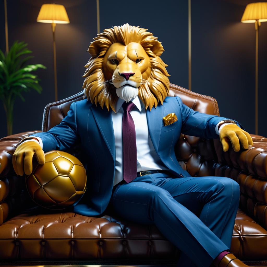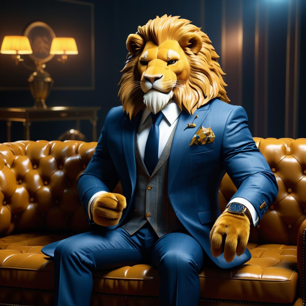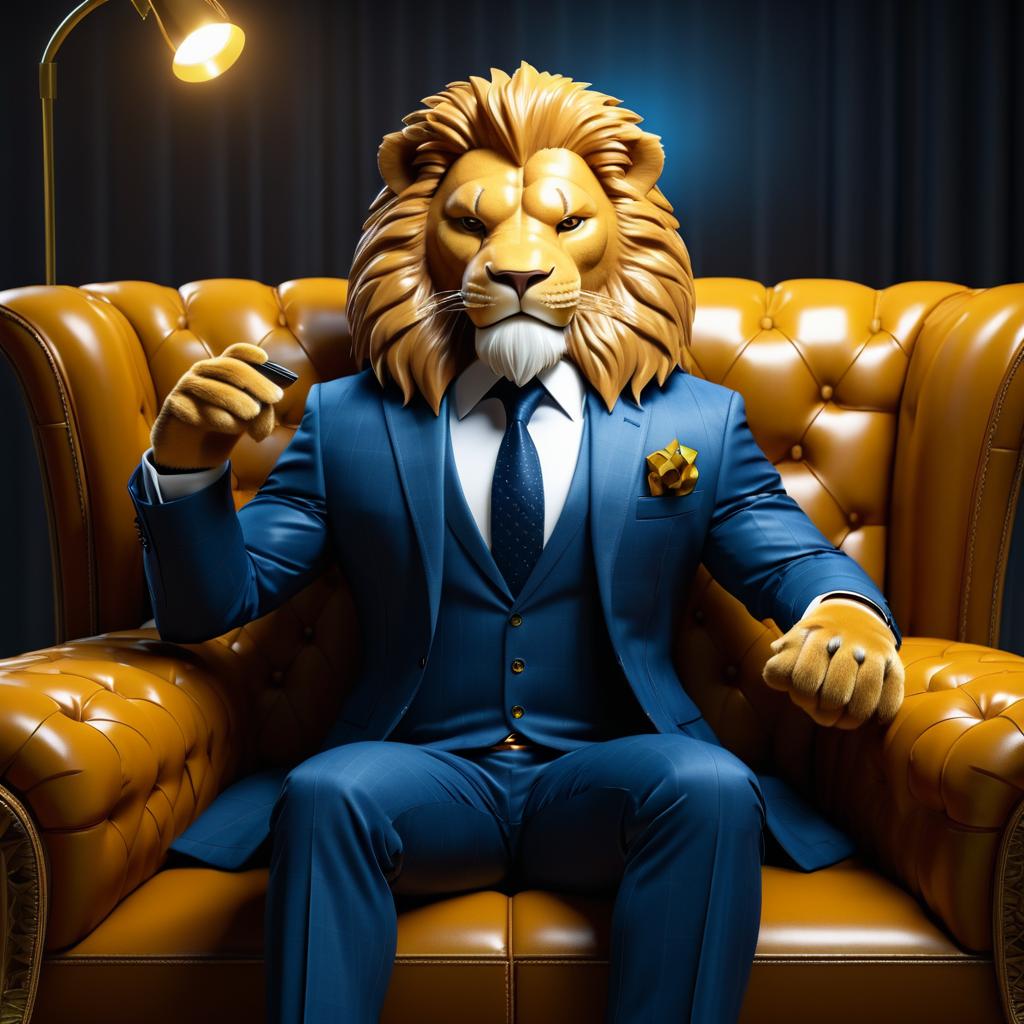 Anthropomorphic Lion in Blue Suit on Leather Couch