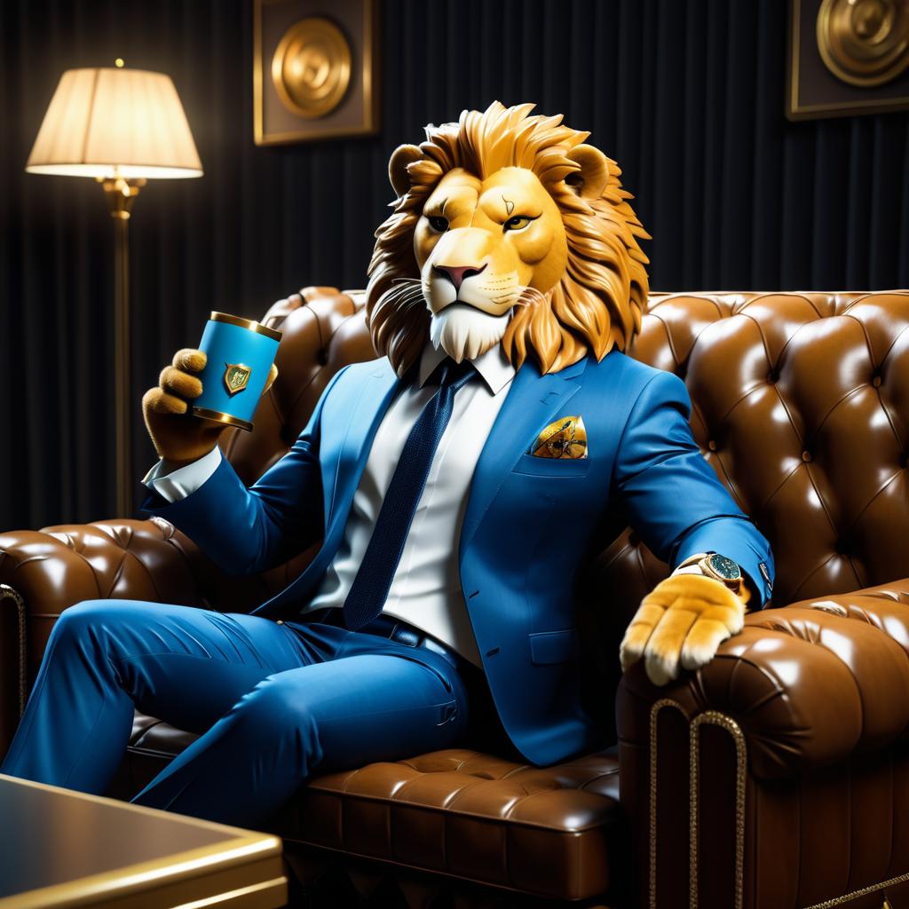 A detailed 3D-rendered anthropomorphic lion character dressed in a blue suit, white shirt, and navy tie, sitting on a brown tufted leather couch. The lion holds a stylish blue and gold cup and has a matching pocket square. The scene is set indoors with warm studio lighting, a floor lamp, and dark wall panels with gold decorations, rendered in a video game art style.
