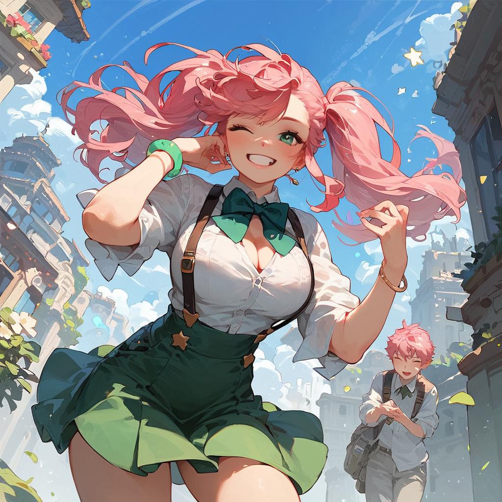 This digital anime-style illustration depicts a cheerful, pink-haired girl with twin pigtails, winking and smiling, wearing a white blouse with a green bow tie, black suspender shorts, and a green skirt. Her large breasts are prominently displayed. She is set against a bright blue sky with scattered clouds and surrounded by tall, sunlit buildings. In the background, a pink-haired boy with a short haircut, dressed in a white shirt and grey pants, looks at his phone while walking. The scene is filled with sunlight, shadows, and floating leaves, creating a lively, dynamic atmosphere. The art style is vibrant and detailed.