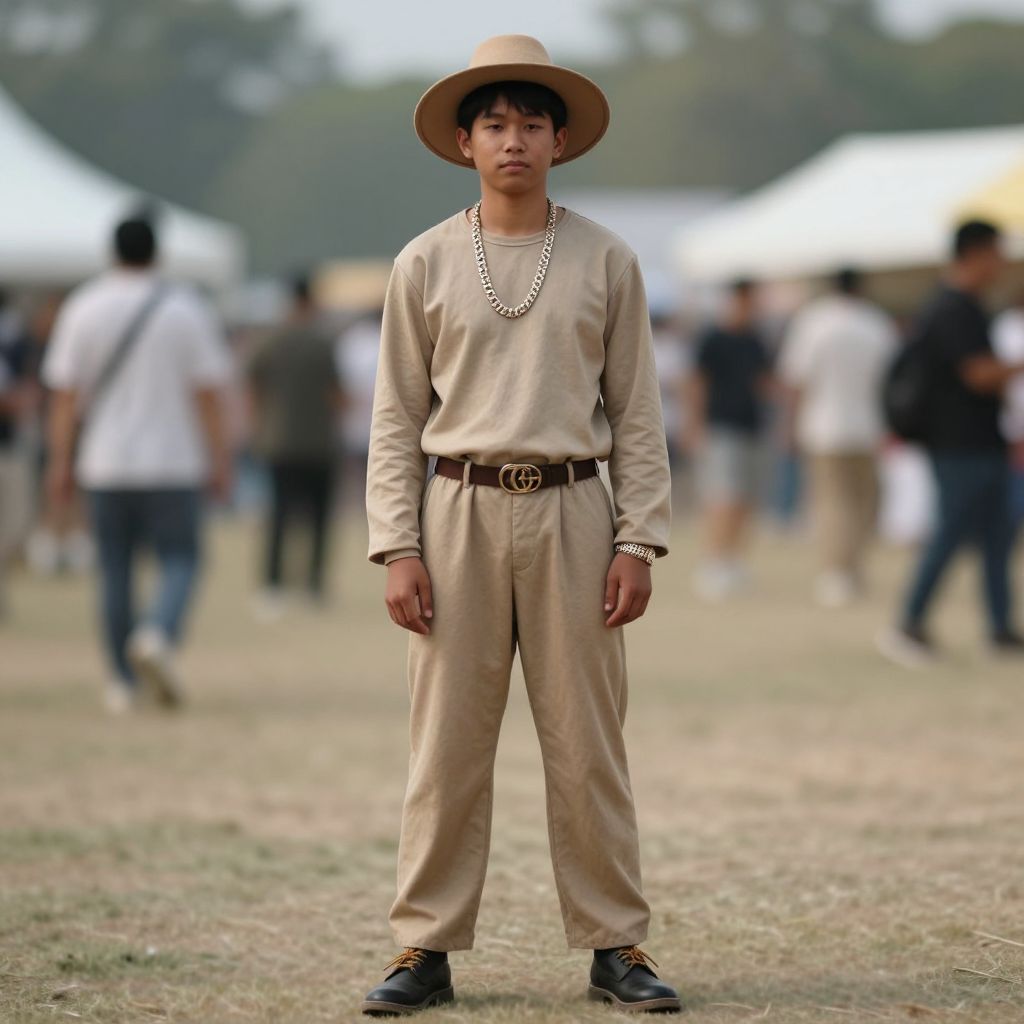 Photograph of an Asian man standing in a grassy outdoor area. He wears a tan, long-sleeved tunic with matching pants, a brown belt with a gold buckle, black shoes, and a wide-brimmed tan hat. A white beaded necklace hangs around his neck. The background is slightly blurred, showing a crowd of people in casual attire and white tents. The man's expression is neutral, and the overall setting suggests a fair or festival. The lighting is natural, and the image has a shallow depth of field, focusing sharply on the man while the background remains blurred.