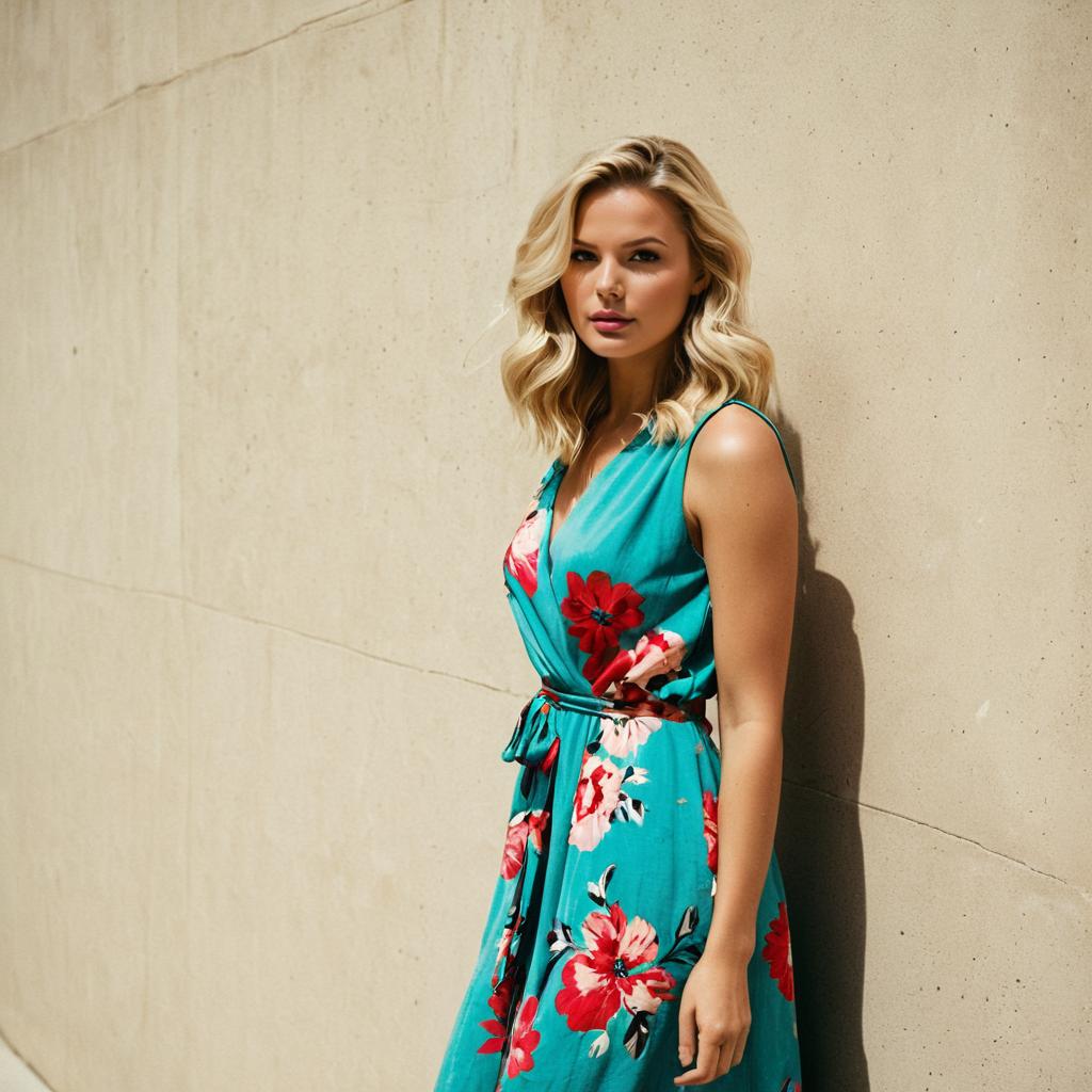 Woman fashion, photograph of a blonde woman standing against a beige concrete wall, wearing a sleeveless, turquoise dress with large pink and red floral patterns, wavy shoulder-length hair, natural light, soft shadows, casual style, neutral expression, daytime, no accessories