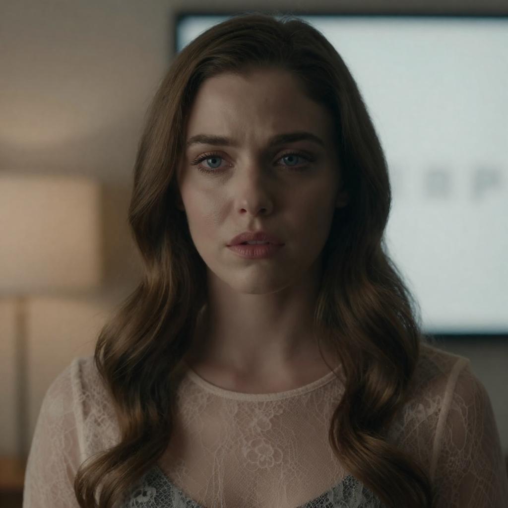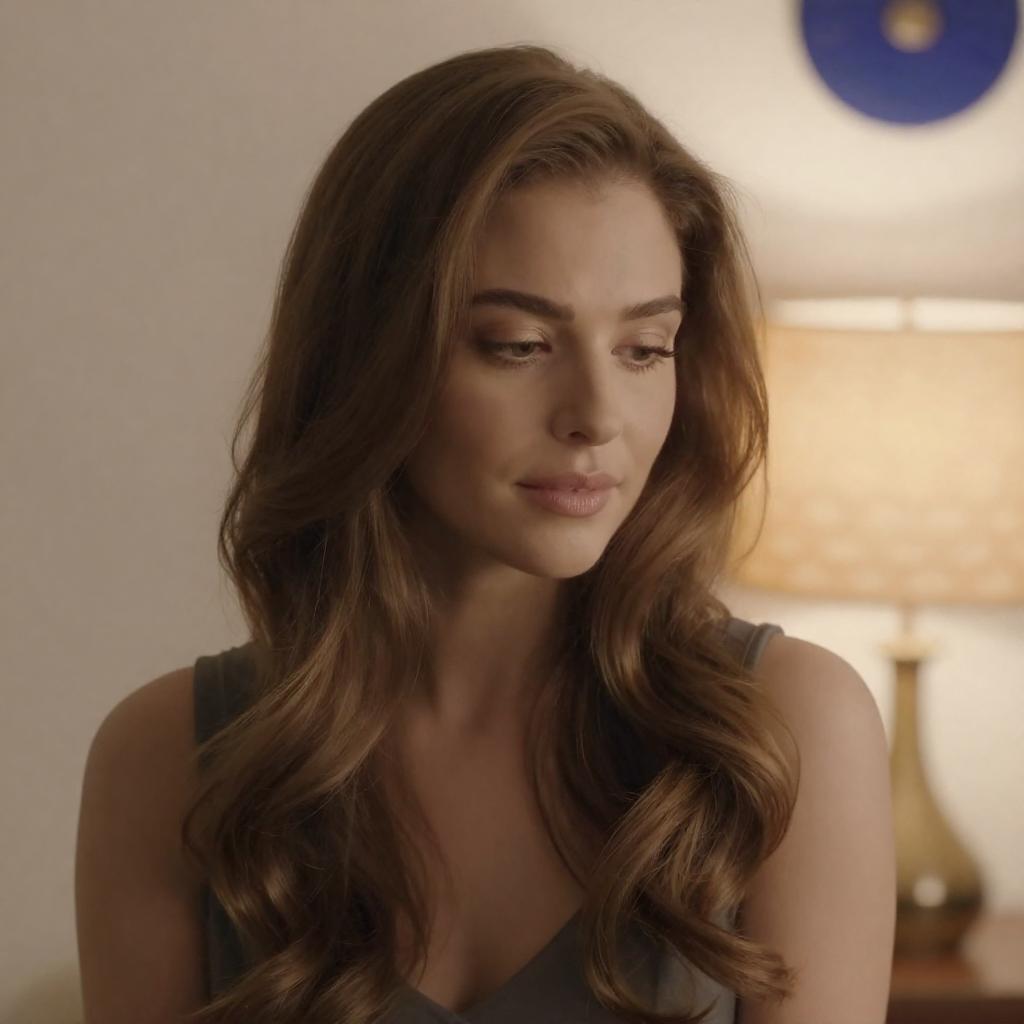 Photograph of a woman with wavy brown hair, light skin, and blue eyes, partially illuminated by soft light. She looks to the right with a neutral expression. Background is dim and blurry. She wears earrings. Blurred object in foreground.