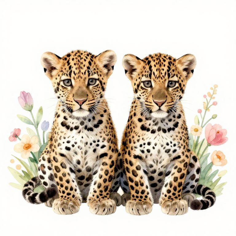 Two adorable leopard cubs with photorealistic watercolor pastel skin sit on a white background, surrounded by a beautiful flower arrangement.