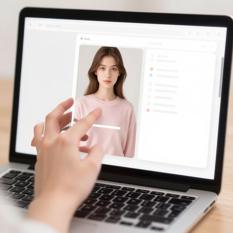 Photograph of a laptop with a black screen displaying a brightly lit image of a young woman with long brown hair, wearing a light pink long-sleeve top. The woman's expression is neutral, and she is centered in the frame. A hand with light skin is in the foreground, pointing at the screen. The laptop is silver with a black keyboard. The background is blurred, emphasizing the laptop and the screen. The image has a clean, modern aesthetic.