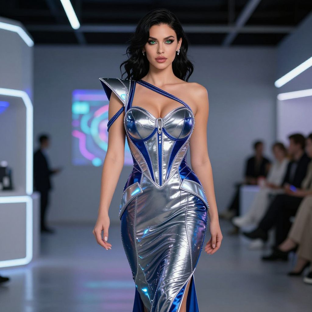Photograph of a confident, dark-haired model in a shiny, metallic silver one-shoulder gown with blue accents, walking a futuristic runway.