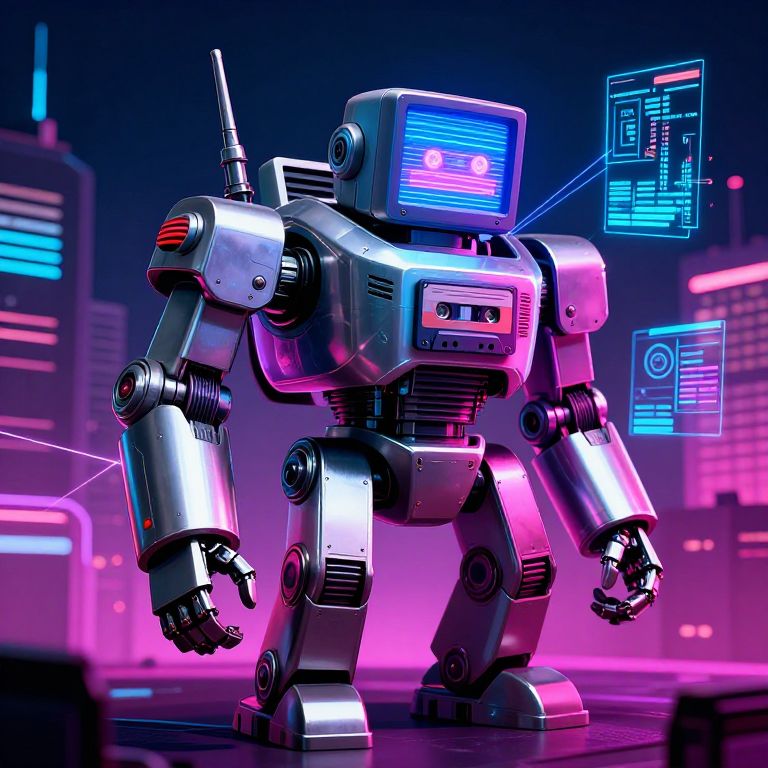 80s AI robot in neon-lit cyberpunk cityscape, bulky metallic android with cassette tape elements and CRT screen face, surrounded by holographic data streams and laser light effects, high contrast shadows, retro tech vibe with a futuristic twist