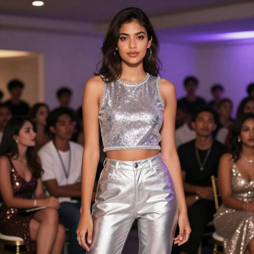 Young woman wearing a silver sequin sleeveless crop top paired with metallic silver pants, standing confidently in front of a seated audience at an indoor event. She has medium skin tone, dark wavy hair, and is accessorized with large hoop earrings and rings. The background shows a diverse crowd dressed in evening wear.