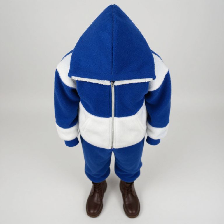 A person is wearing a blue and white outfit with a hood over their head. The person is also wearing brown boots.
