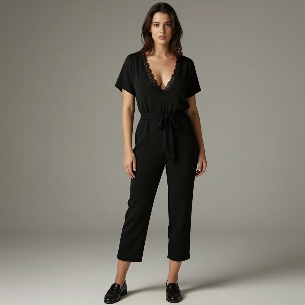 "Woman, casual chic, black jumpsuit with short kimono-style sleeves, plunging neckline with lace trim, cinched waist with tie belt, straight-leg pants cropped above the ankle, black leather loafers, no visible accessories, neutral studio background.. Sexy. Pretty face and beаutiful eyes. Big breasts."