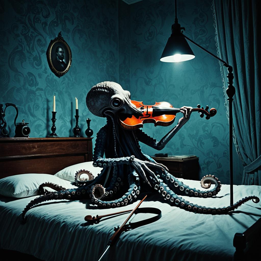 A surreal and dramatic illustration of an octopus playing the violin, lying in bed with a scythe in the background. Styled in Symbolism, spotlight lighting, vintage 1800s aesthetic