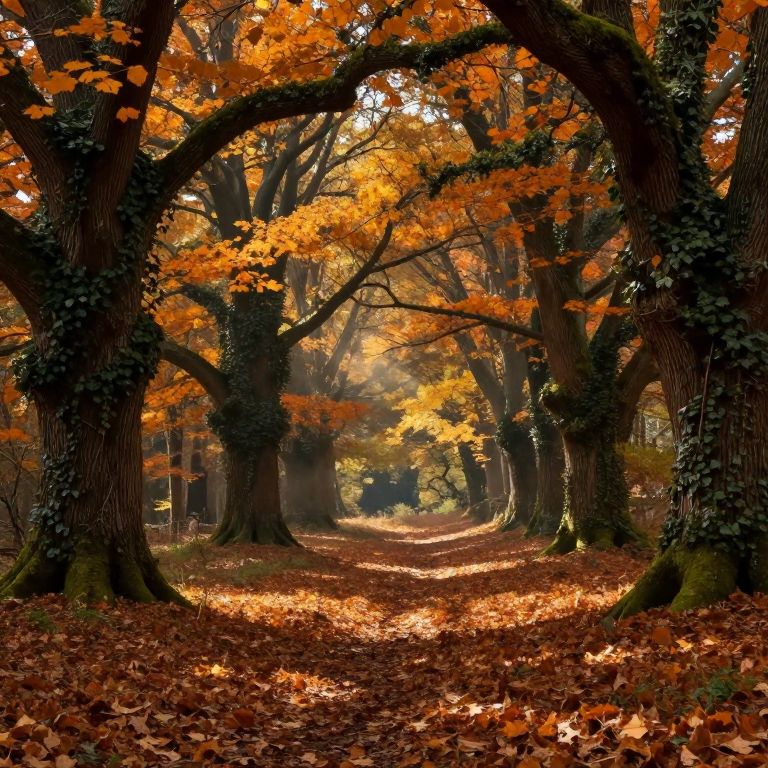 Digital art depicting a tranquil autumn forest scene with towering ancient oak trees covered in ivy and moss. The forest floor is blanketed with orange and gold fallen leaves, illuminated by soft sunlight filtering through the dense canopy. The perspective is low, as if viewed by a woodland inhabitant, creating a mystical and serene atmosphere with patterns of light and shadow.