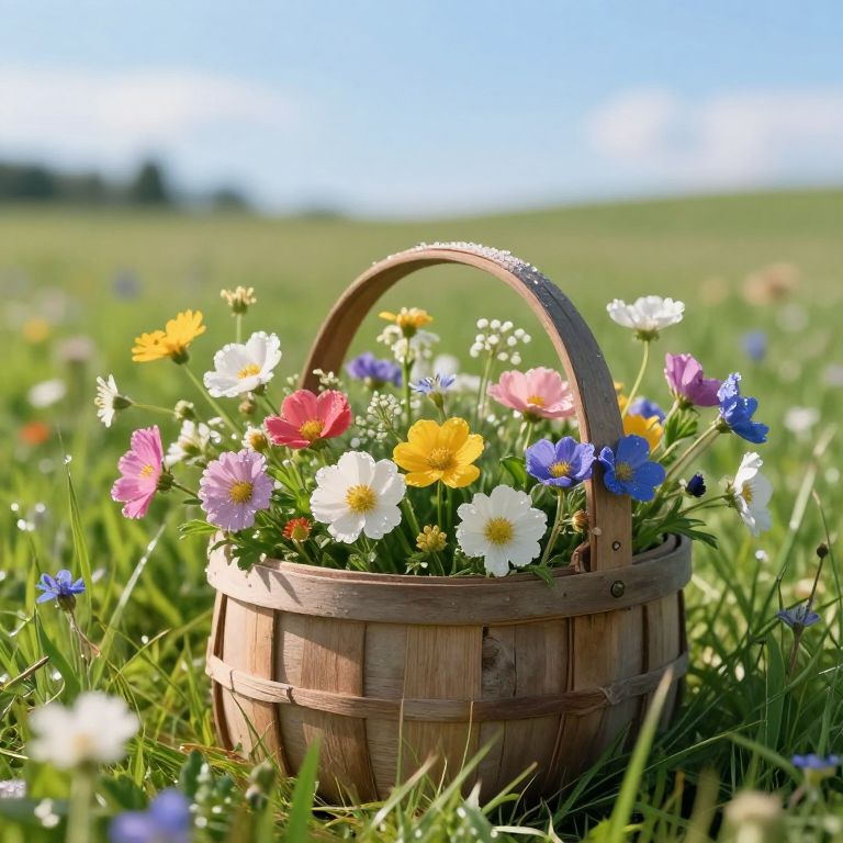 Rustic Basket of Vibrant Wildflowers in Meadow