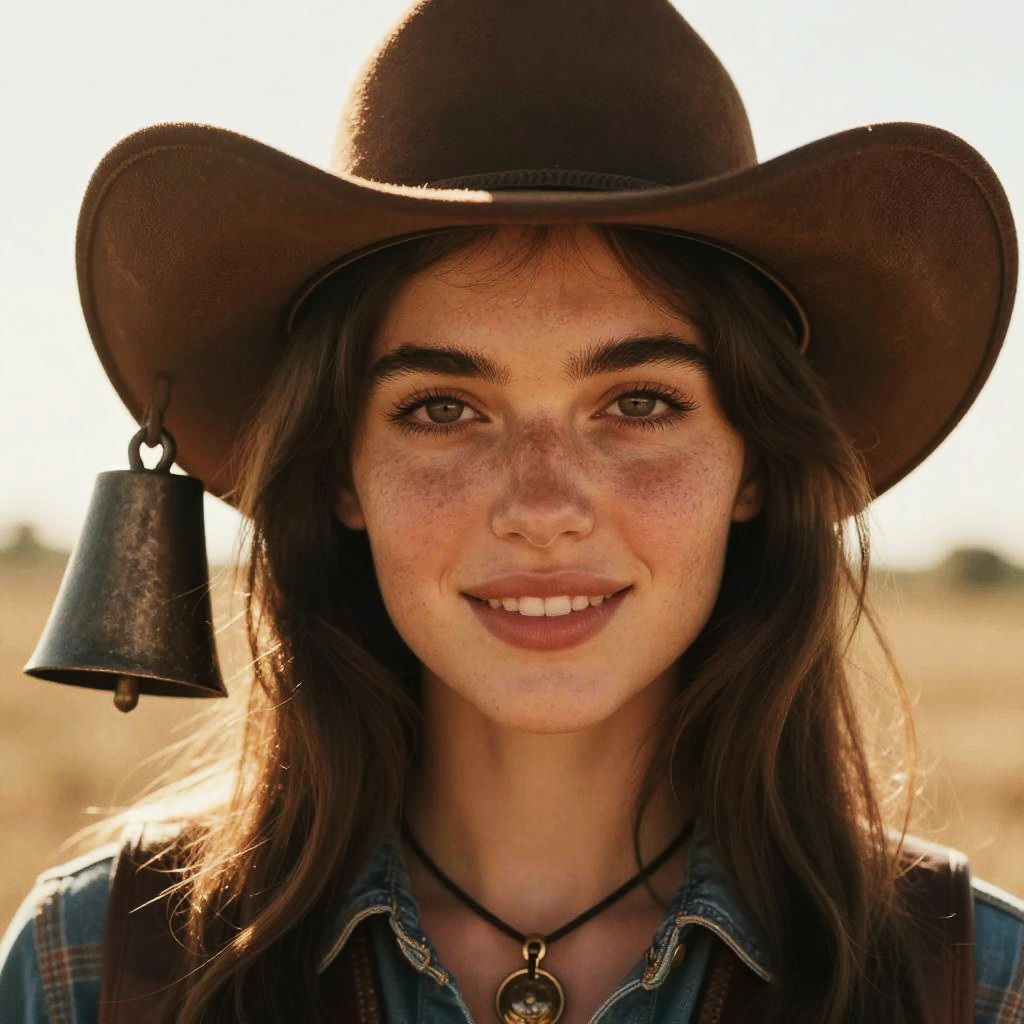 Photograph of a young blonde woman with blue eyes, wearing a brown cowboy hat and white shirt, standing by a sunlit pool.