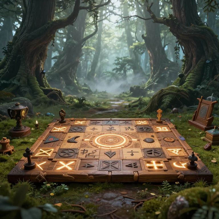 Tak game in a mystical forest setting, featuring ancient wooden boards with glowing symbols, surrounded by ethereal fog and tall twisted trees, soft natural lighting, high fantasy atmosphere, intricate details on game pieces and environment