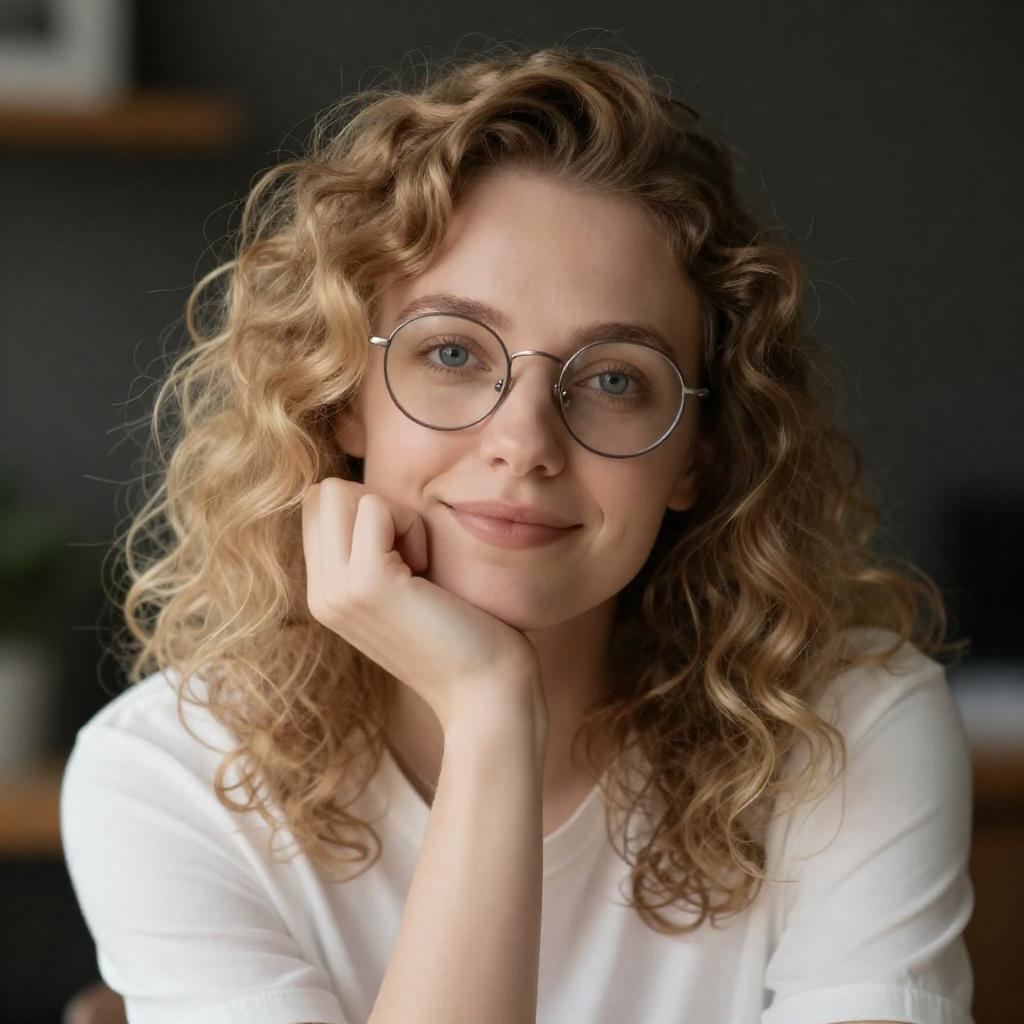 Photograph of a woman with curly, blonde hair and blue eyes, wearing round glasses and a white shirt. She rests her chin on her hand, smiling slightly. The background is blurred, dark, and indistinct. Her expression is warm and engaging.