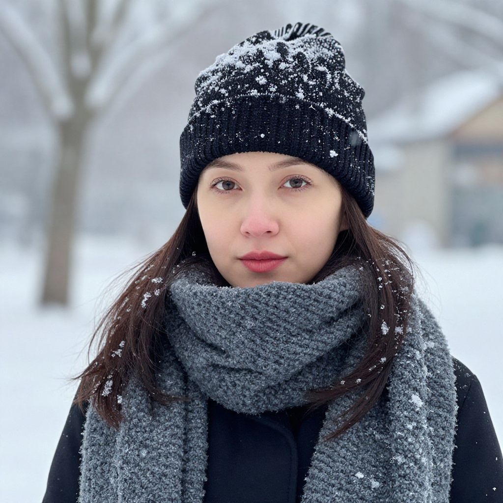 Photograph of a young Asian woman with fair skin and long dark brown hair, wearing a black beanie with snowflakes and a thick gray scarf. She has full lips, slightly parted, and dark brown eyes. She is dressed in a black coat, standing outdoors in a snowy landscape. Snowflakes are visible on her hat and scarf. The background is blurred, showing a leafless tree and a building with a light gray facade. The overall color palette is dominated by whites and blacks, with the gray scarf providing contrast. The image has a soft, natural light.